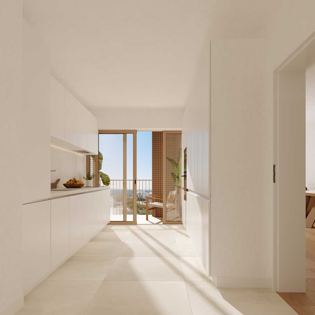 Uma sala com cozinha integrada, amplas varandas e ambientes de cores claras com acabamentos de alta qualidade são apenas algumas das características destes apartamentos com áreas entre os 52m2 e os 79m2.